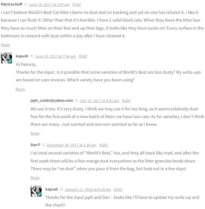 When we wrote about World’s Best Litter back in 2016, we don’t even remember how many reviews we went through. There was nothing about dust in any of them – in fact, some of them claimed it was not dusty at all. But then there was this comment (followed by a conversation with other visitors to our site):