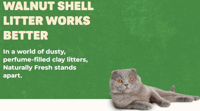 | Naturally Fresh | Walnut Shell | Clumping: Yes | Dust: ? | Tracking: Low | Odor Control: Good |